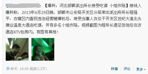昨日18时许,有网民发布微博爆料:“河北邯郸派出所长接受吃请,小姐作陪。接线人爆料称,2013年6月29日晚,邯郸市公安局开发区分局常庄派出所所长程某,在辖区内查获违法经营赌博机后,接受当事人在位于开发区世纪大道北头康业温泉大酒店吃请,并有多名小姐作陪。视频截图为程所长酒足饭饱后在该酒店KTV包房内。有图有真相!”